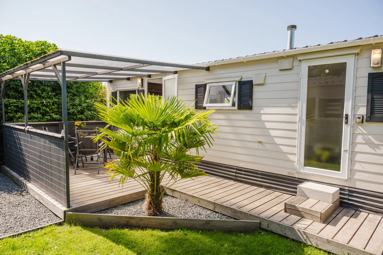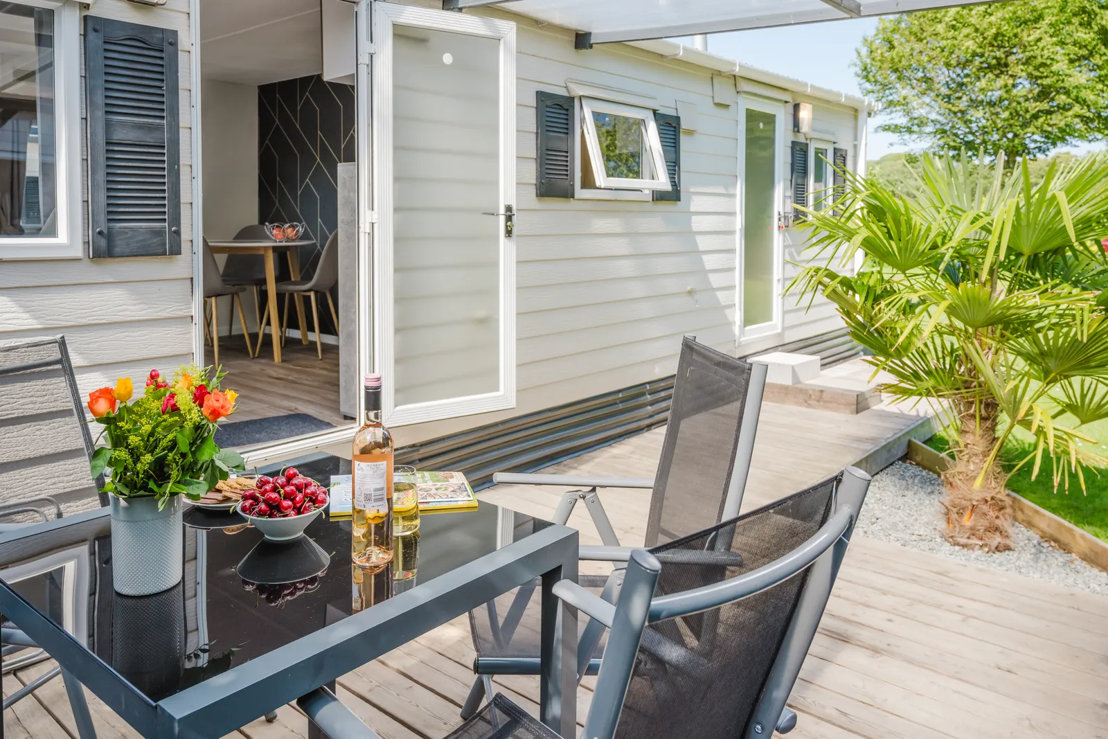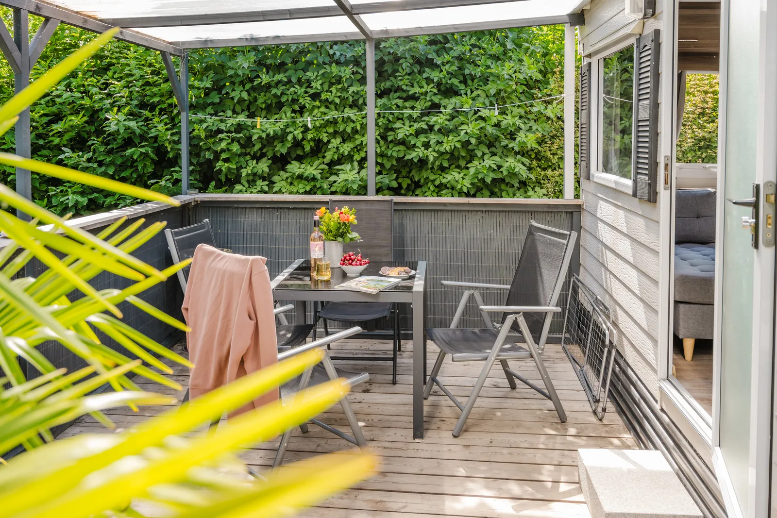 Die großzügige glasüberdachte Holzterrasse schafft ein tolles Urlaubsambiente. Jede Terrasse ist mit komfortablen Sitzgelegenheiten ausgestattet. Lasst den Sommerabend auf der Holzterrasse ausklingen.