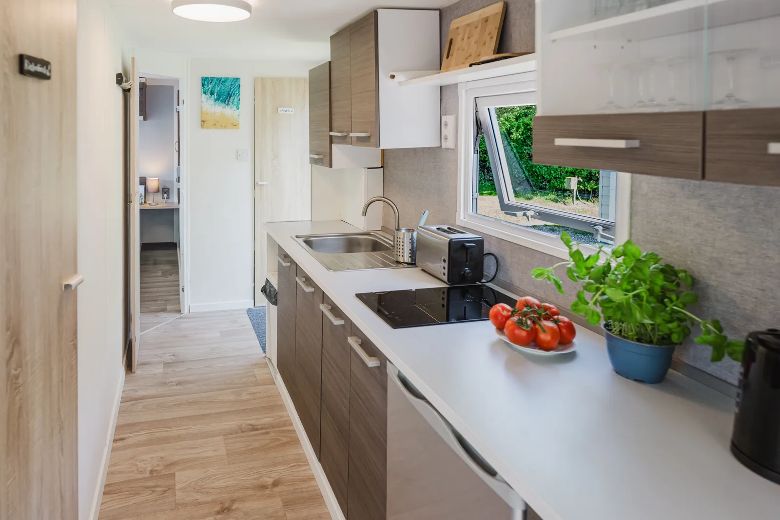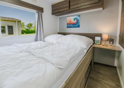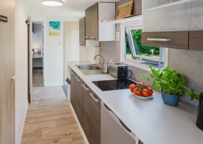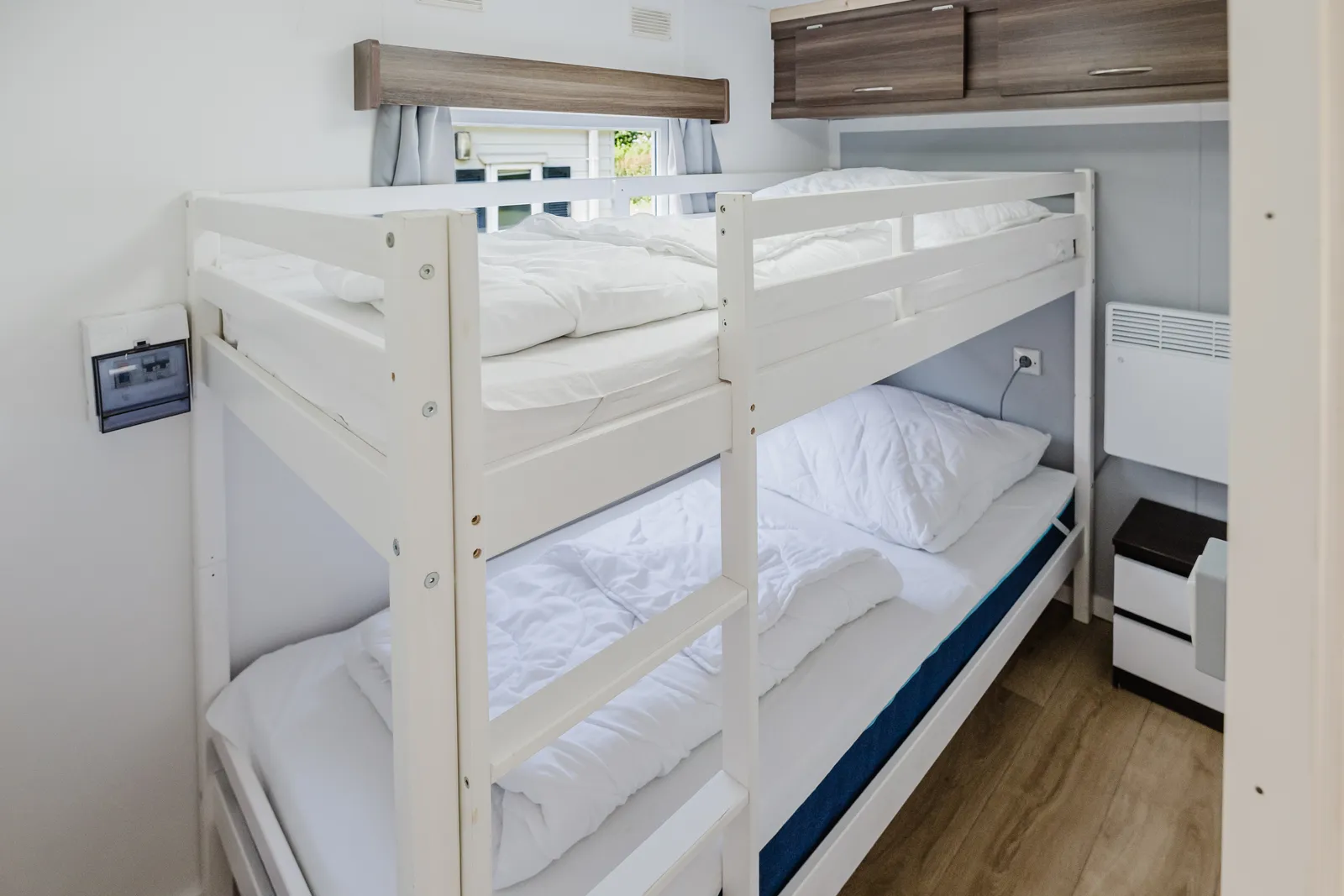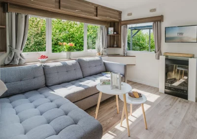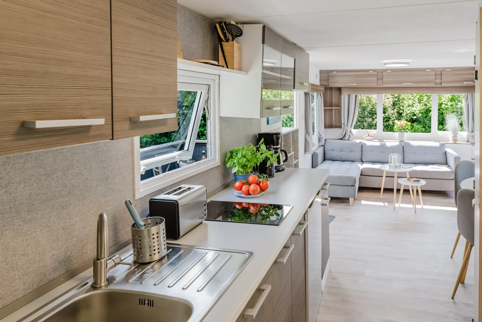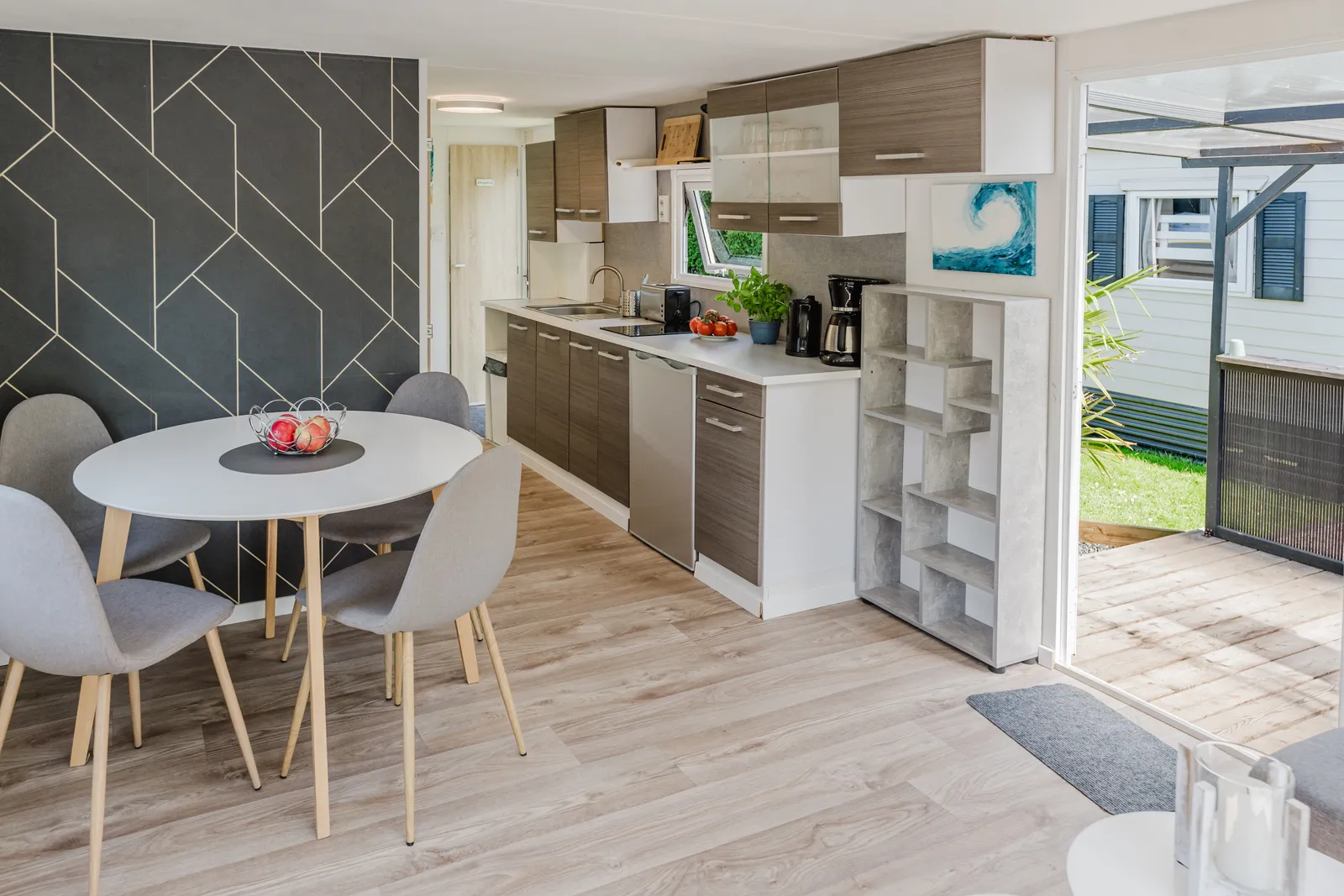 Die modern eingerichteten TiBu-Mobilheime sind für 4-5 Personen ausgelegt, wobei der fünfte Schlafplatz auf einem Schlafsofa im Wohnbereich ist.